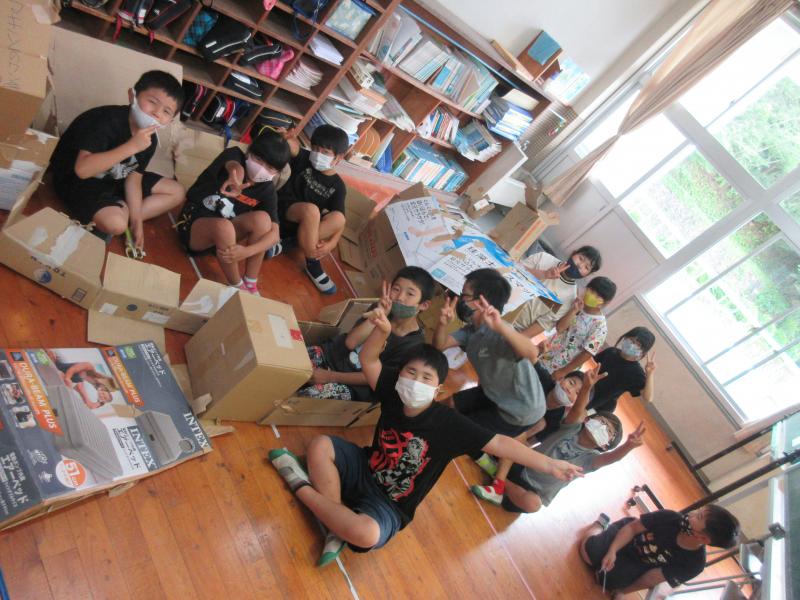 4年生は、ダンボールを切ったり広げたりつなげたりして、一つの共同作品を作りました。協力し楽しみながら、着々と作っていく子ども達・・・。最後には大きな「船」が完成し、子ども達も大興奮。自分たちの手で工夫して作り上げていく楽しさを存分に味わった時間になりました。