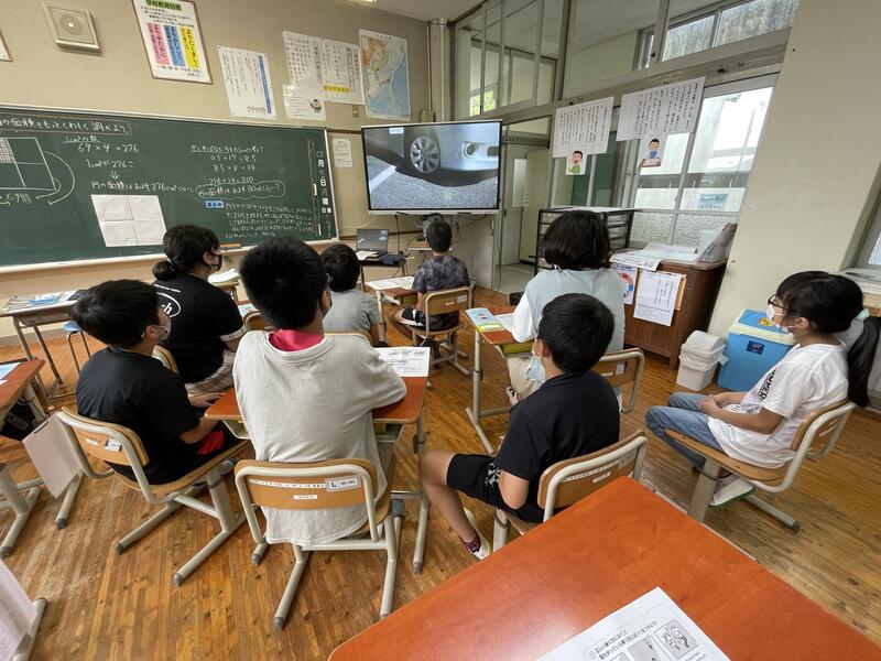 屋外で実施予定でしたが、昨日出された大雨の予報のため、屋内でリモートによる交通安全教室を行いました。