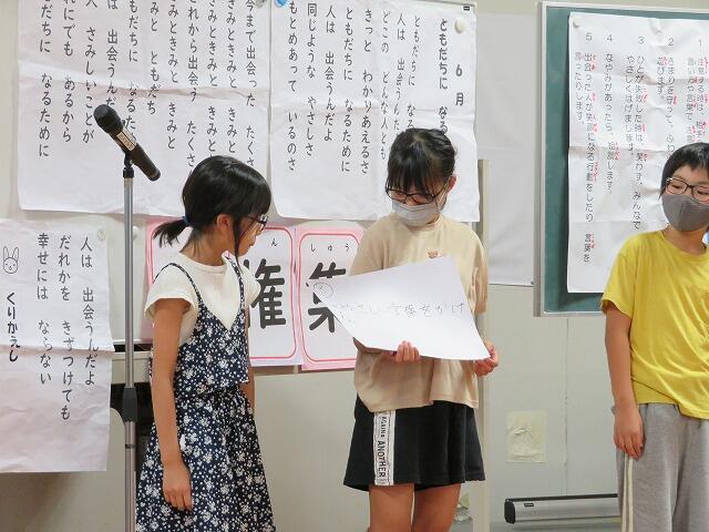 4時間目、教育実習生の松本先生が、国語の研究授業をしました。優しい語り口で、子どもたちに問うと、それに応えるように元気よく答える子どもたち。一人一人を大切にした授業が展開されました。