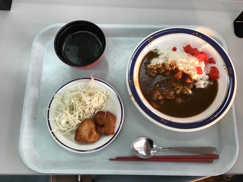 18:30から夕食。メニューは、カレーライス、キャベツのサラダに唐揚げ、ワカメスープでした。よく動いたからかみんなペロリと食べてしまいました。