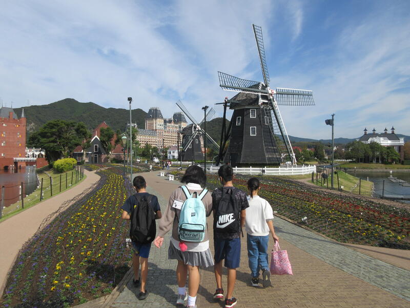 2日目は、ハウステンボスへ向かい、そのきれいな風景や楽しいアトラクション、おいしい食事をみんなで楽しみました。佐世保バーガーの大きさに驚く子ども達。体験型アトラクションでは腰が引けながらも楽しむ子ども達。お土産を選びながら楽しく会話している子ども達。いろいろな表情を見ることができました。