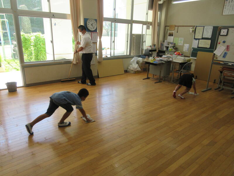 みんなで協力して、床がピカピカ!