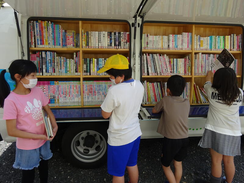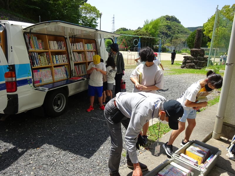22日、水俣市立図書館から自動車いっぱいに本を積んで来ていただき、子どもたちが好きな本を借りることができる巡回図書が今年度はじめて行われました。