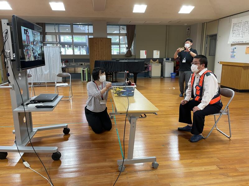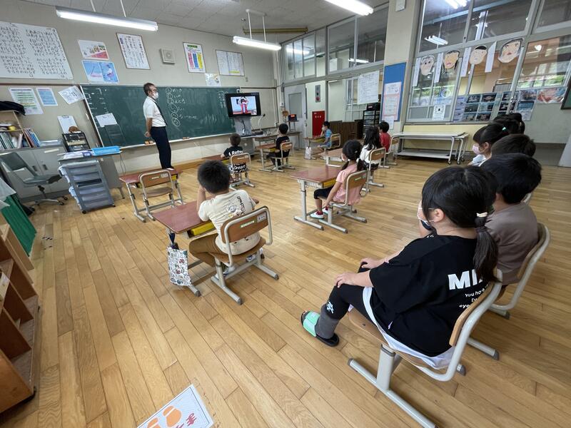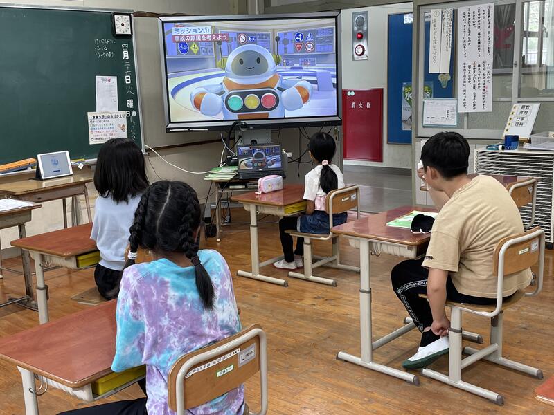屋外で実施予定でしたが、昨日出された大雨の予報のため、屋内でリモートによる交通安全教室を行いました。