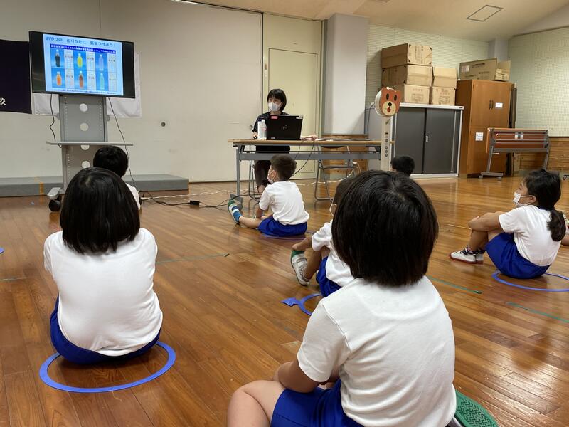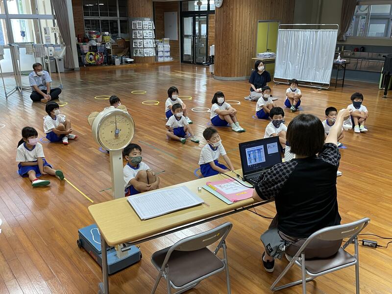 前半の時間に低学年は、保健指導「暑い夏の過ごし方」と体重測定。
