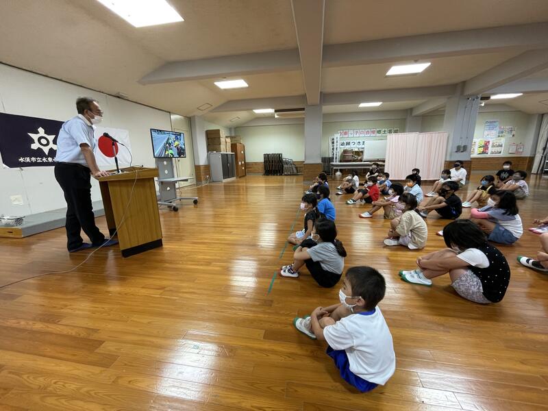 校長からはNHKの「みんなのうた」でも放送された「ててて!とまって!」を使って、道路を横断するときの3つの点を子どもたちと改めて確認しました。