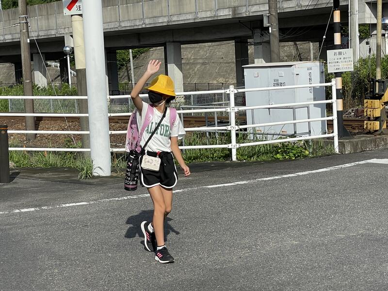 ふたつめ、「わたるまえに てを あげて 『とまって!』 のあいずを うんてんしゅさんに する。」