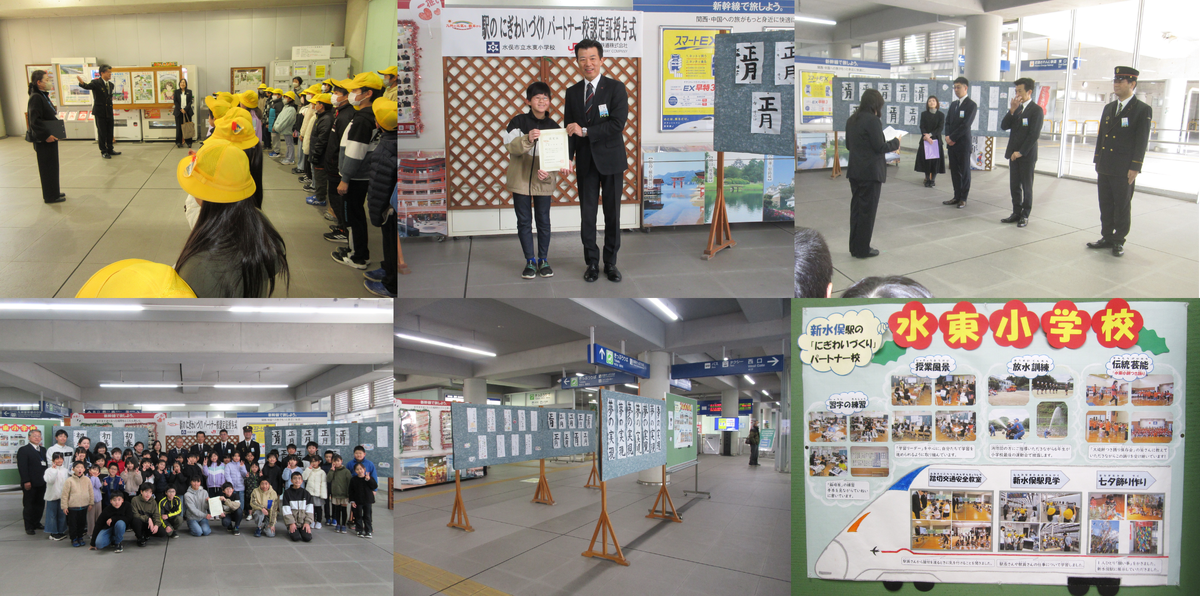 1月15日(木)の10時から行われた授与式には、1・2・3・4・6年生が参加し、無事に式典を終えることができました。代表児童がJR九州熊本支社長より認定証を受け取り、全校児童が書いた書初めをバックにみんなで記念撮影をしました。子供達がとても礼儀正しく参加していたので、主催者の皆様も感心しておられました。これから、パートナー校として、これまで以上に交流を深め、「駅のにぎわいづくり」を盛り上げていきたいと思います。