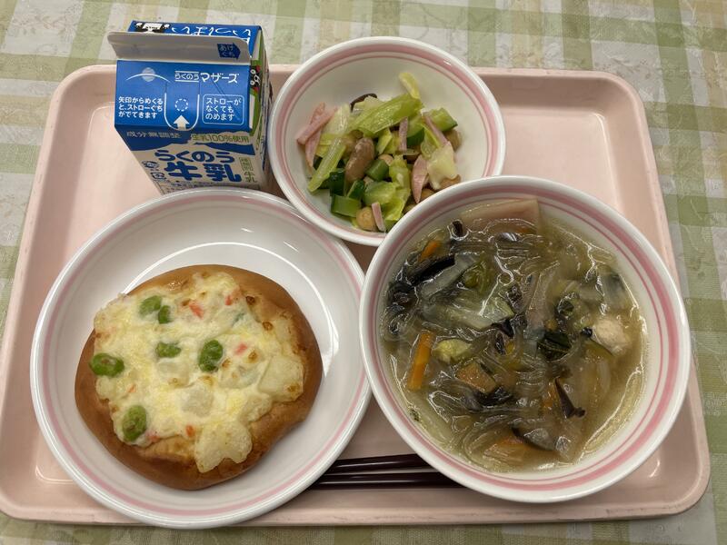 ポテトサラダパンは、給食室の皆さんが一つひとつ心を込めて成形し、焼き上げてくださった逸品です。手作りならではの柔らかな食感と優しい味わいに、子供たちも「美味しいね!」と声を弾ませていました。また、今日も寒さが厳しい一日となりましたが、具だくさんで熱々のはるさめスープが、子供たちの体を芯から温めてくれました。いつも栄養バランスを考え、最高に美味しい給食を提供してくださる栄養職員の先生、調理員の皆様に、心より感謝申し上げます。