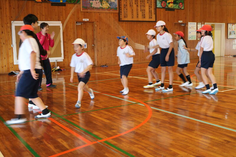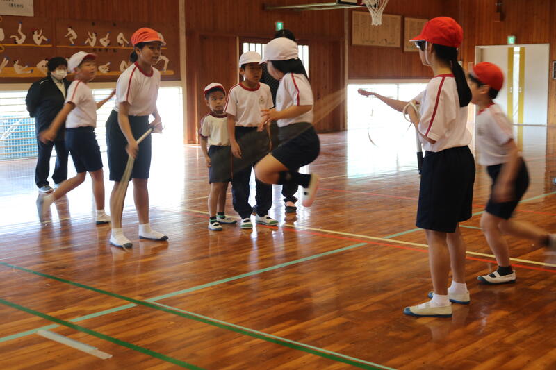 後半は、「きょうだい班(縦割り班)」による長縄跳びです。3分間、全員の呼吸を合わせて跳んでいました。「はい! はい! はい!」「1、2、3」とリズムを取る元気な声が体育館に響き渡ります。練習を始めたばかりの頃は、回る縄を前に足が止まっていた低学年の子供も、今日はお兄さん・お姉さんの背中を追いかけ、速いスピードの中へ勇気を持って入って跳んでいました 。