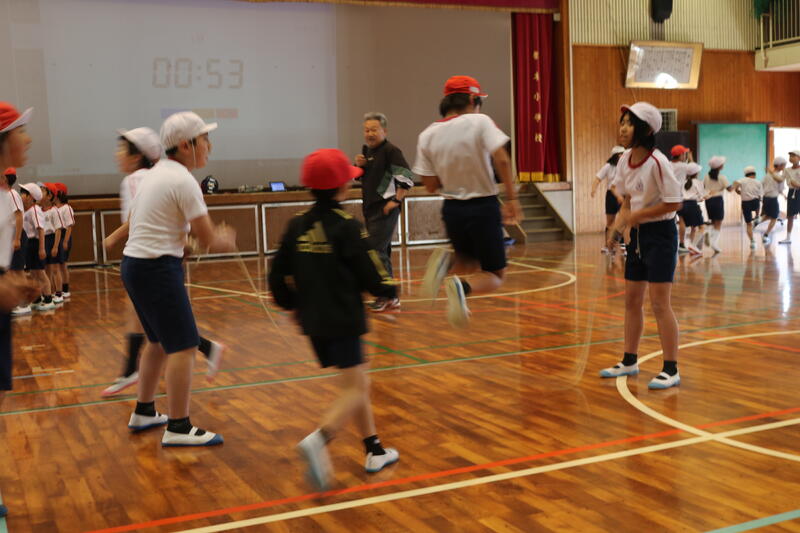 前半は、一人一人が自分の目標に向かって突き進む個人跳びの測定です 。1分間という限られた時間の中で、一回でも多く、一秒でも長く跳び続けようとする眼差しは真剣そのもの でした。低学年は、「前とび」や「前かけ足とび」、中学年は、手首を巧みに使う「あやとび」、高学年は、さらに難易度の高い「交差とび」に挑みました。5・6年生が1・2年生の記録を優しく数えてあげる姿も見られ、異学年交流の温かい光景が随所に見られました 。自己ベストを更新して飛び上がって喜ぶ子も、惜しくも目標に届かず悔しさを滲ませる子もいましたが、どの子も時間いっぱい、自分自身の限界に挑む姿は立派でした。