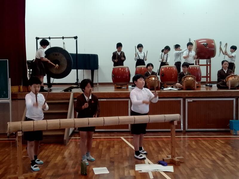 一方、4年生は社会科の「地域で受け継がれてきたもの」という学習テーマのもと、栖本太鼓の担い手である末松様をお招きしました。末松様は、太鼓を次世代に受け継ぐことへの熱い想い、これまでの苦労、太鼓の歴史、そして何よりも演奏を終えたときの大きな喜びを、子どもたち一人ひとりの質問に丁寧に答える形で話してくださいました。講話の終わりには、簡単な太鼓の動きを実践指導していただく機会がありました。子どもたちは、末松様から直接教わった動きを真似て一生懸命体を動かしましたが、「見ていた以上にハードで、太鼓を叩くことの大変さ」を身をもって感じたようです。その表情からは、地域に根付く伝統の重みと、それを守り続ける方々の並々ならぬ努力を理解した様子がうかがえました。