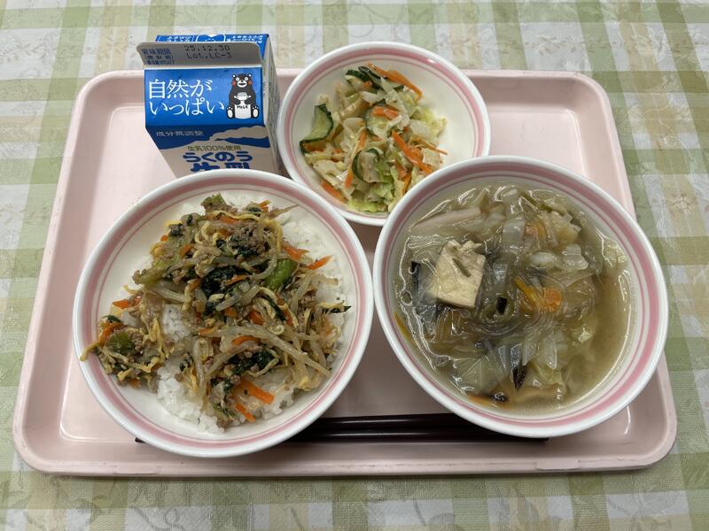 12月17日(水)、本日の給食をご紹介します。 今日のメニューは、スタミナ満点の「ビビンバ」、温かい「中華春雨スープ」、そして「ちくわサラダ」に「牛乳」でした。教室を回っていると、「校長先生、これ美味しすぎます!」という嬉しい声があちこちから聞こえてきました。 あまりの美味しさに、自然と顔を見合わせて笑みがこぼれる子どもたち。その笑顔を見ているだけで、こちらまで幸せな気持ちになります。子どもたちは、味付けもボリュームも満点で、心もお腹も満たされていました。 栄養職員の先生、調理員の皆さん、いつも愛情たっぷりの給食をありがとうございます。