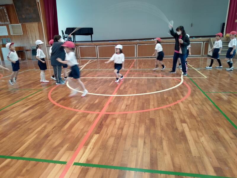 競技内容:3分間で、縄の中を1人ずつ跳んで抜け出た合計回数を競います。 途中でひっかかって縄が止まっても、時計は止めずにそのまま計測を続け、合算して数えます。クラス全員で1つのチームを作り、運動が苦手な子も得意な子も、みんなで声を掛け合いながら一丸となって取り組みます。