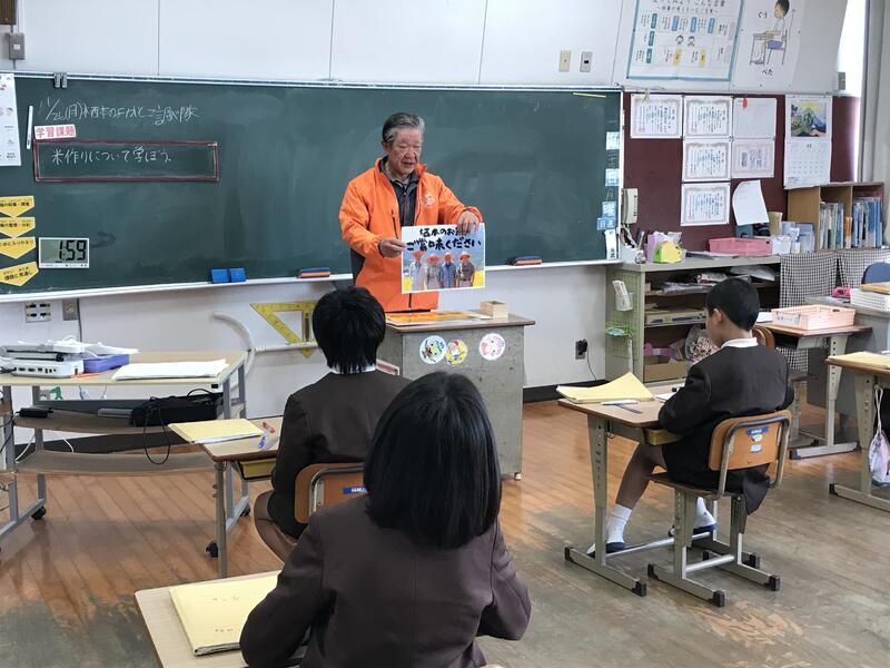 本日1月26日(月)、5年生の総合的な学習の時間「栖本よかとこ調べ隊」に、中河内地区で代々米づくりを営まれている、渡邉さんをゲストティーチャーとしてお招きしました。今回のテーマは、私たちの栖本町が誇る米「小ヶ倉清き米」のひみつを探るです。渡邉さんのお話では、「なぜ、小ヶ倉清き米をつくったのか?名前の由来は」?」「なぜ、このお米は美味しいのか?」などなど。どれも子供たちにとって、興味のあるお話でした。お米のおいしさの秘密は、「水」にあるそうです。小ヶ倉観音の滝からこんこんと湧き出る、清らかな水。その恵みをたっぷりと受けて稲が育つこと。また、単に自然の恵みだけでなく、農家の方々が八十八の手間をかけ、我が子を育てるように深い愛情をかけられていること。その「情熱」と「丁寧な仕事」こそが、美味しさの真の理由であることを学びました。ふるさと栖本の豊かな自然と、そこで働く方々の思いに触れた子供たち。自分たちの住む栖本町がもっと大好きになった、実り多き1時間となりました。