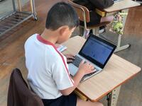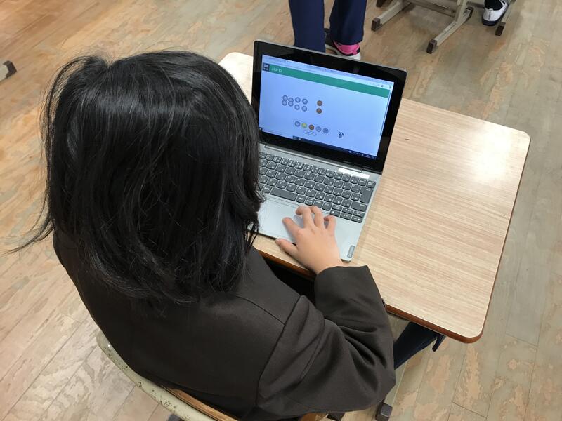 算数の授業にお邪魔すると、1年生が「28円の払い方」を一生懸命に考えていました。手元には、お金のイラストが映し出されたタブレット。指先ひとつで「10円玉を2枚と、1円玉を8枚……」と並べていきます。タブレットの良さは、試行錯誤を恐れずに済むことです。「あ、この組み合わせもあるな」と思えば、瞬時にやり直しができます。また、友達が作った画面を自分の手元でパッと確認し、「そんな出し方もあったのか!」と参考にすることもできます。タブレットという強力な味方を得て、1年生の算数的思考はどんどん自由で豊かなものになっています。