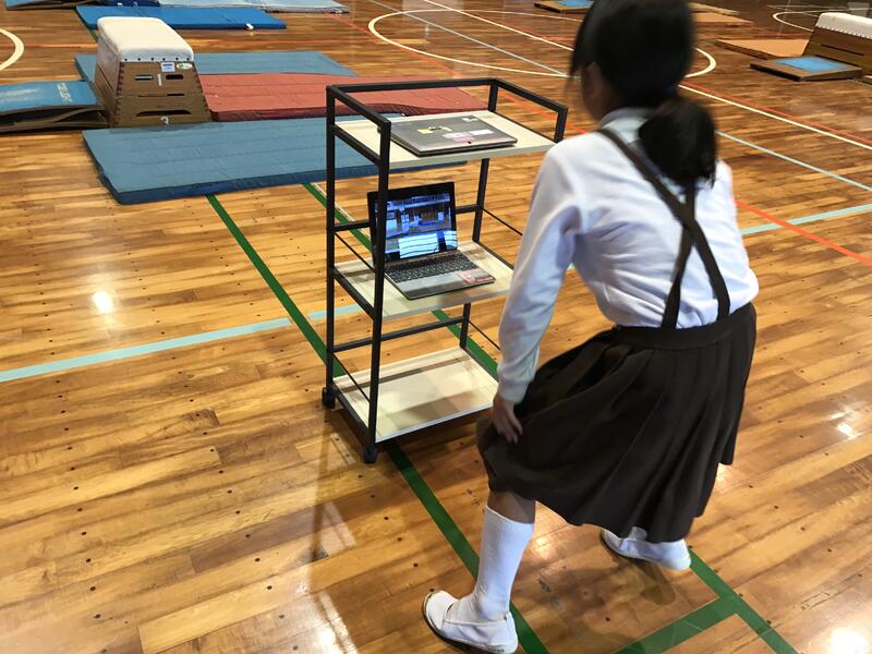 一方、体育館では3年生が跳び箱運動に挑戦していました。跳び箱のすぐ横には、録画状態にしたタブレットが置かれています。これは、子供たちが自分の跳ぶ姿を記録し、「いつでも、必要な時に」振り返ることができるようにするためです。授業中に全ての映像をチェックするわけではありませんが、「今の着地はどうだったかな?」「手のつき方はよかったかな?」と気になった瞬間や、練習の区切りに、自分自身の動きを客観的な映像で確認できる環境があることは、子供たちにとって大きな安心感と意欲に繋がっています。自分の姿を鏡のように映し出してくれるタブレットは、上達を目指す子供たちにとって、今や欠かせない「頼もしい相棒」となっているようです。