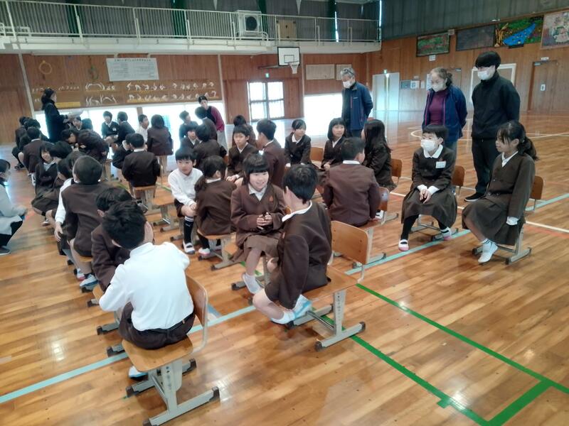 続いて、体育館では5年生との交流が行われました。5年生は、新一年生が安心できるようにと、優しい笑顔でゲームをリードしたり、心を込めて絵本の読み聞かせをしたりしてくれました。小さな手を取って歩く5年生の姿に、高学年としての自覚と、下級生を思いやる「栖本っ子」の優しさを感じました。
