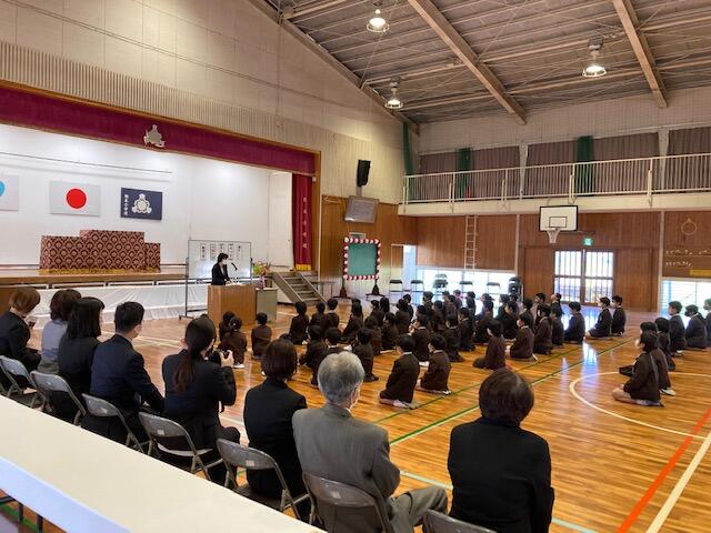 まず、児童会から今月の目標が発表されました。目標は「忘れ物をしないようにしよう」。自分で持ち物を管理する習慣は、学習の土台を築く上で非常に大切です。高学年の児童が率先して呼びかける姿は、まさに下級生の良いお手本となっており、本校が大切にする自主性と責任感の芽生えを感じさせます。また、「歯と口の健康週間」に関連する図画・ポスター、習字、標語の各コンクール、そして天草市のコンクールで見事に入賞を果たした児童たちの表彰を行いました。名前を呼ばれた時の誇らしげな表情、大きな拍手を送る仲間の温かい眼差し――努力が形になった喜びを皆で分かち合いました。表彰の後は、今月の歌である「ありがとうの花」を、体育館いっぱいに響かせました。また、今月の詩「かく」を全校で朗読しました。そして、児童会からは、学校生活の基本である「あいさつ運動」についての、具体的な取り組みの説明がありました。地域の方々にも元気な挨拶を届けられるよう、子どもたち自身が主体となって活動を広げてくれることを期待しています。