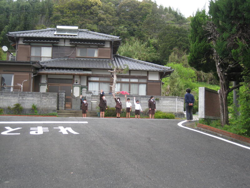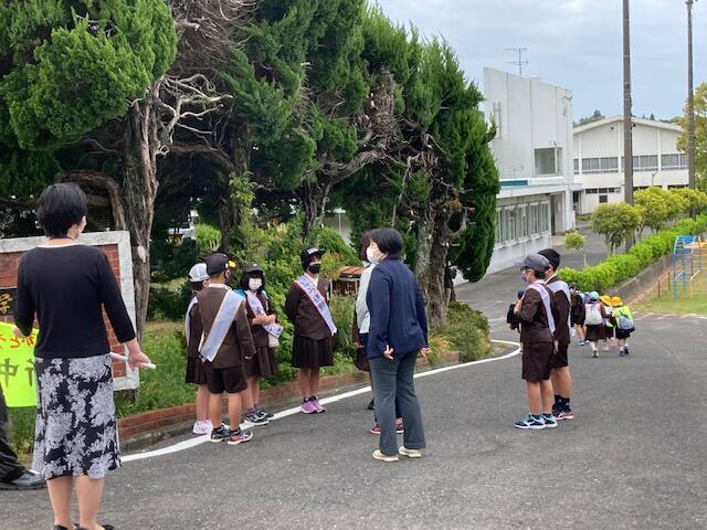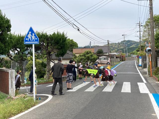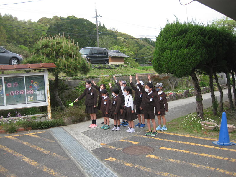 今日は新入生を迎えて、各登校班での横断歩道の渡り方の練習をしました。登校班長がリーダーとなってみんなに指示を出し、きれいに並んで横断することができていました。挨拶もとても上手にできています。素晴らしい!