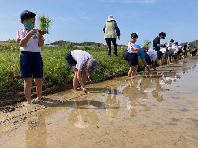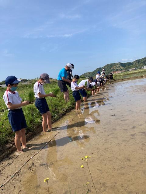 今日は5年生は田植えを体験しました。広い田んぼに横一列で並び、11人全員で丁寧に植え付けていきました。子供たちはとても田植えが楽しかったようで、あっという間の2時間の体験でした。協力いただいた地区振興会の皆さん大変お世話になりました。