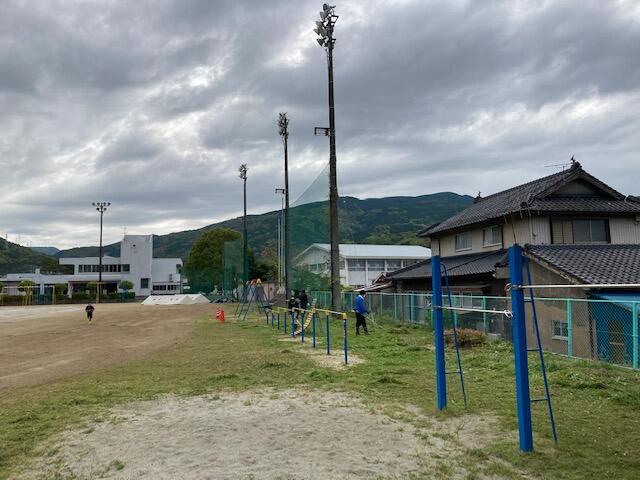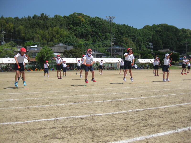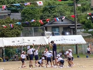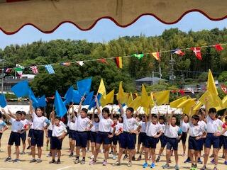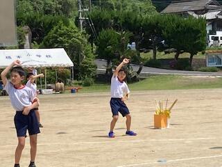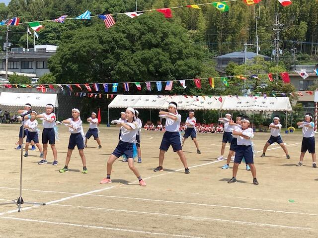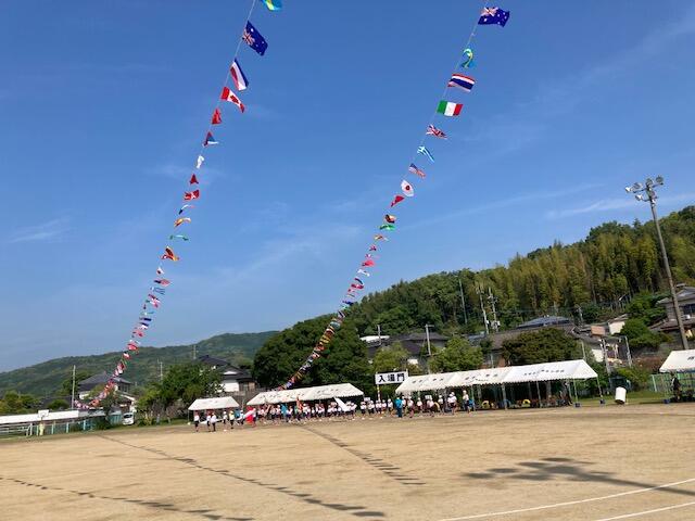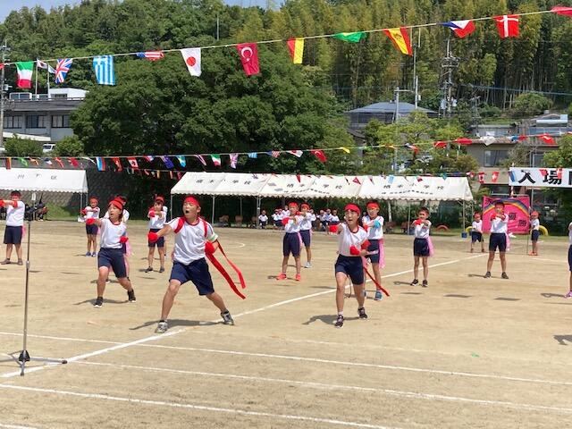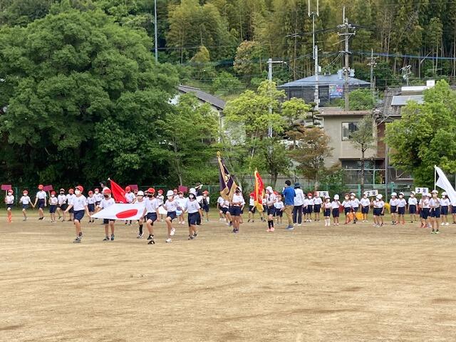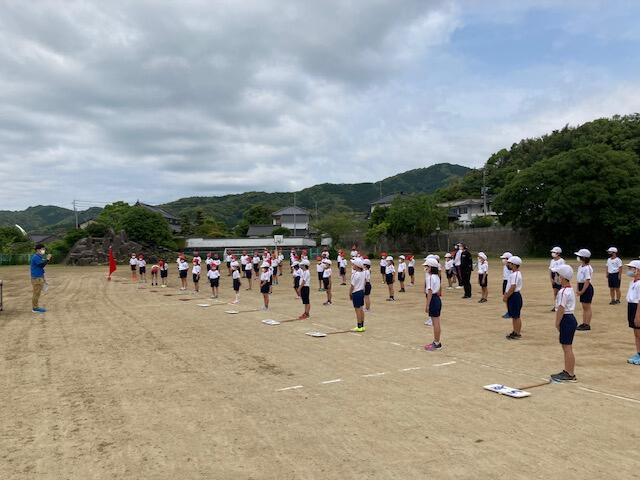 連休明け、美しく整備された運動場で、いよいよ運動会練習がスタート。まずは開会式練習から開始です。全校児童、よく集中し練習に参加していました。