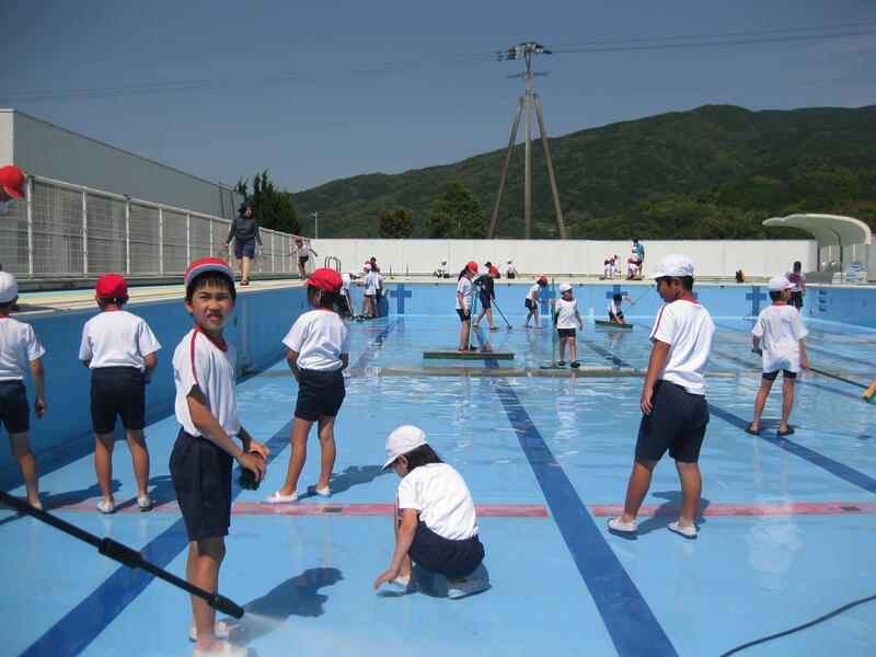 6月2日(木)プール掃除 晴天の中、3年以上の児童みんなでプールをピカピカに磨きました。子供たちも大変水泳の授業を楽しみにしています。プール開きも晴れるといいな!