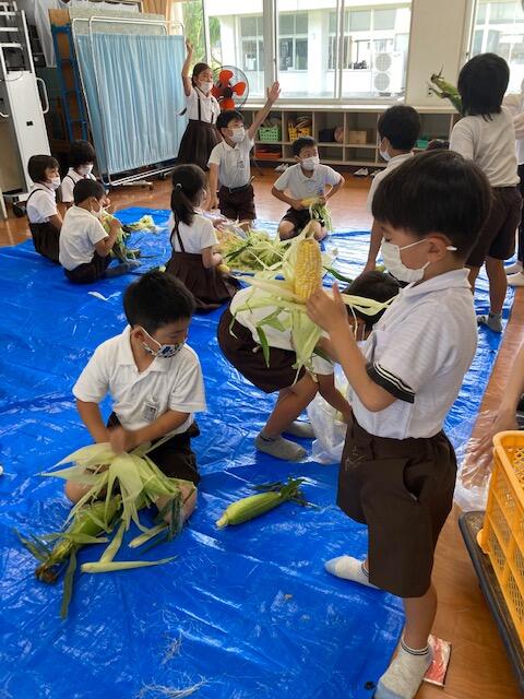 今日は1・2年生は地産地消の食育の一環として栖本町の松本様の畑で収穫されたトウモロコシの皮むきを体験しました。このトウモロコシは今日の給食に調理されて出されます。今はトウモロコシのおいしい季節です。この故郷の味を子供たちが味わうことは食の大切さを知る大切な機会となります。
