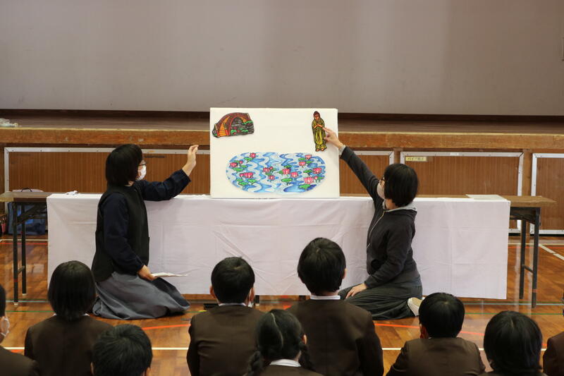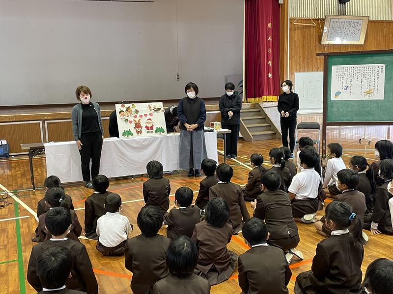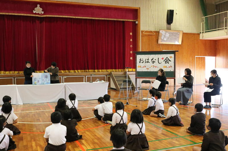 読み聞かせボランティア「ひまわりの会」の皆さんによるお話会が行われました。11月の読書月間のイベントとして毎年恒例となっている行事で、子供たちも楽しみにしています。2校時は1~3年生、3校時は4~6年生を対象に、発達段階に合わせた内容を工夫していただきました。箱の挿絵が物語に合わせてどんどん変化していく「桃太郎」(1~3年)や、芥川龍之介の「蜘蛛の糸」(4~6年)、他にも絵描き歌、手遊び歌やリトミック、学校司書による読み聞かせなどもあり、子供たちの笑顔や真剣な表情がたくさん見られました。ひまわりの会の皆さん、素敵な時間をありがとうございました。