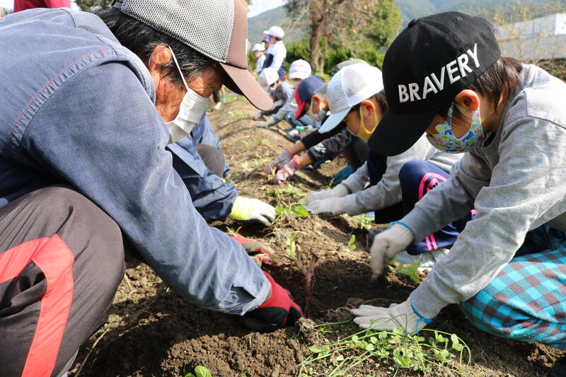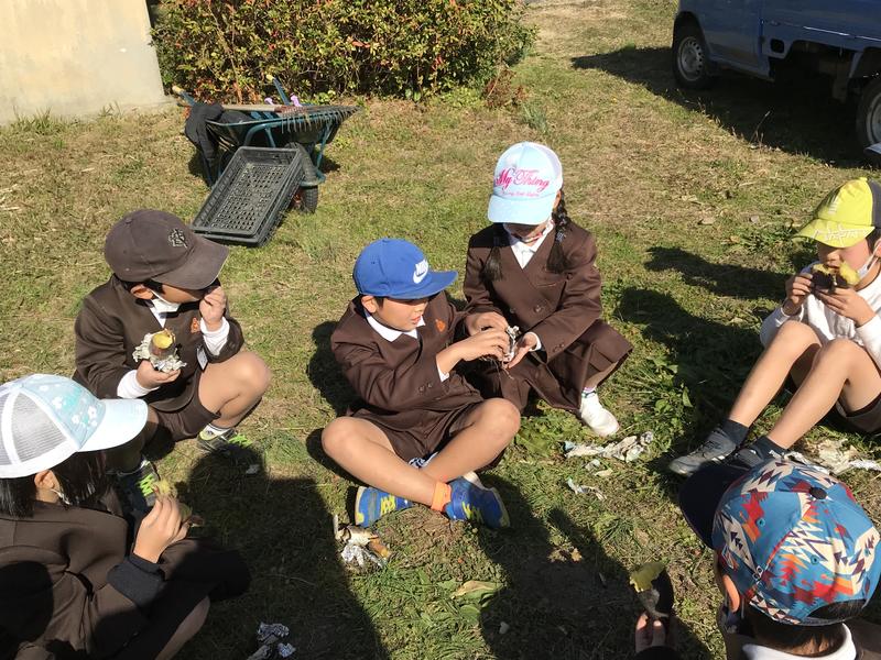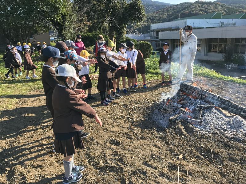 1,2年生が生活科の時間に育てて11月に収穫したサツマイモを、焼き芋にしていただきました。当初はヘルスメイトさんにご協力いただいてサツマイモ調理をする予定でしたが、県の感染リスクレベルが上がったために急遽予定を変更し、地域学校協働活動推進員の渡邉さんにお世話していただきました。収穫した畑でたき火を囲みながらのおいしい焼きいもパーティとなりました。