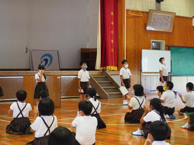8月30日(月)感染防止対策を徹底した上で2学期の始業式を体育館で行いました。冒頭で、夏休みの思い出と2学期に頑張りたいことを代表の子供たちが発表しました。