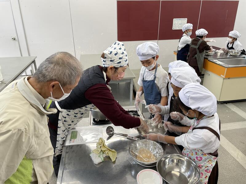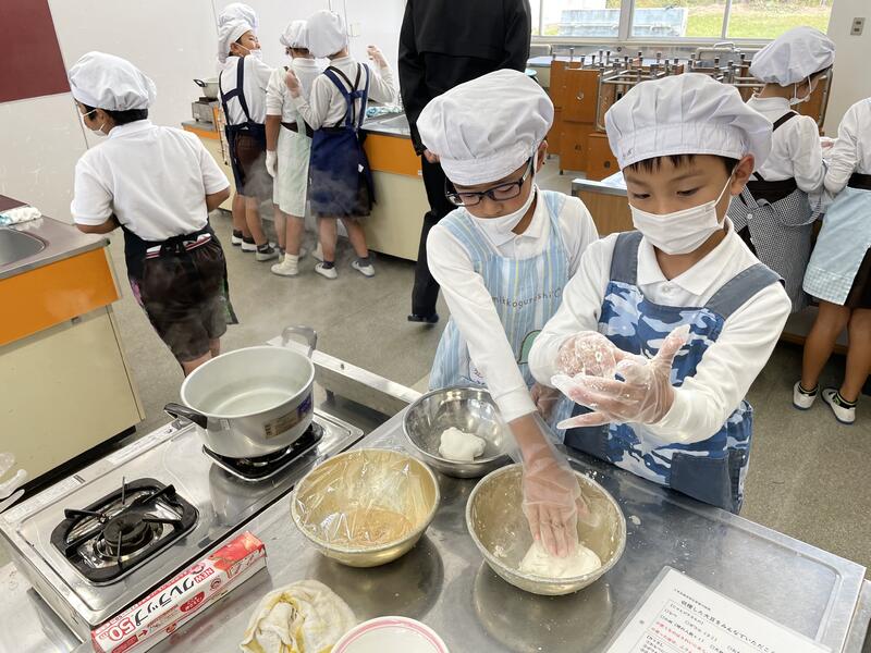 3年生が総合的な学習の時間に「ちびっこ農園」で育てた大豆をきな粉に加工して「きな粉だんご」を作りました。ゲストは大豆作りでたいへんお世話になった吉田さんと地域学校協働活動推進員の渡邉さんです。大豆を煎ってすりつぶした香ばしい香りが家庭科室いっぱいに広がりました。収穫直後に味わった「枝豆」とは全く違う大豆の変身ぶりをみんなでおいしくいただきました。