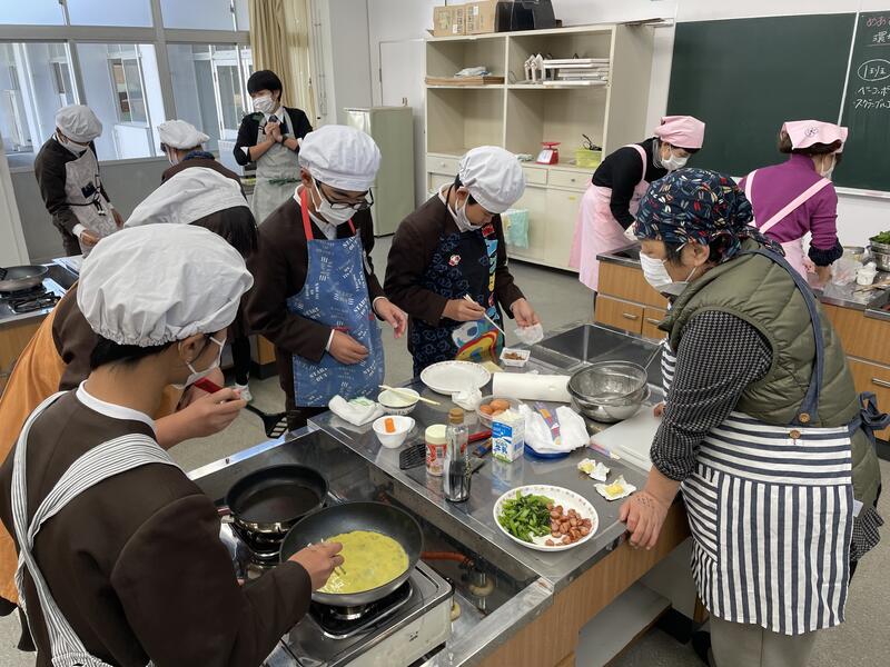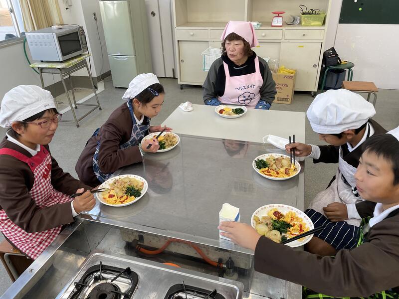 6年生が家庭科の時間に調理実習を行いました。「環境に配慮して、おいしく調理しよう」をめあてに、1班はベーコンポテトとスクランブルエッグ、2班と3班はオムレツと青菜いためを作りました。栖本地域のヘルスメイトさん5人がゲストティーチャーとして協力してくださったおかげで、どの班も手際よく調理を進め、味や彩り、栄養、旬の野菜など、バランスの取れた料理が完成しました。学んだことは早速それぞれの家庭で生かしてくれると思いますので楽しみにされてください。ヘルスメイトの皆さん、ありがとうございました。