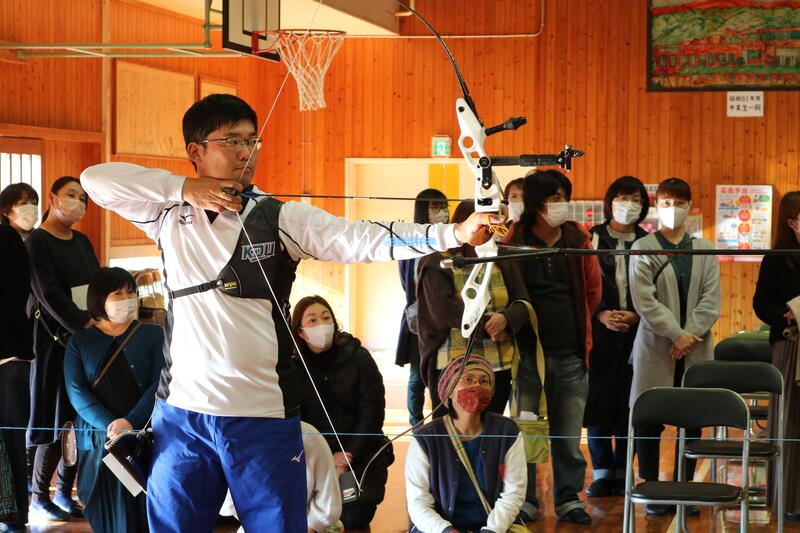 アーチェリー日本代表で東京オリンピック男子個人及び男子団体銅メダリストの古川高晴選手による講演会が行われました。「夢を叶えるために」という演題で、アーチェリー競技のことや、自分の夢を叶えるために努力されていること、モットーとされていることを話してくださいました。子供たちは、真剣に話を聞き、初めて見る本物のメダルやアーチェリーの道具に興味津々でいろいろな質問をしていました。アーチェリーのデモンストレーションもあり、世界トップレベルの技を見せていただき驚きの連続でした。