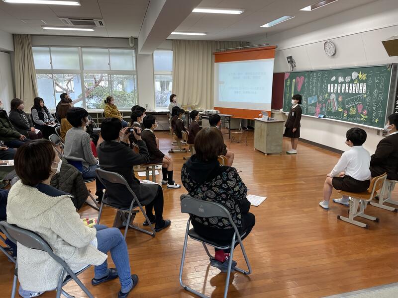 今年度中に10歳を迎える4年生11人が多目的室で「2分の1成人式」を行いました。保護者の皆様に見守られながら、これまでできるようになったことや、将来の夢、ここまで育てていただいた家族への感謝の気持ちなどを発表しました。時間をかけて作ったプレゼンテーションもうまくいきました。相手意識をしっかりもって立派に発表する姿はとても頼もしく感じられました。本当におめでとうございます。これからも夢の実現に向かって頑張ってください。