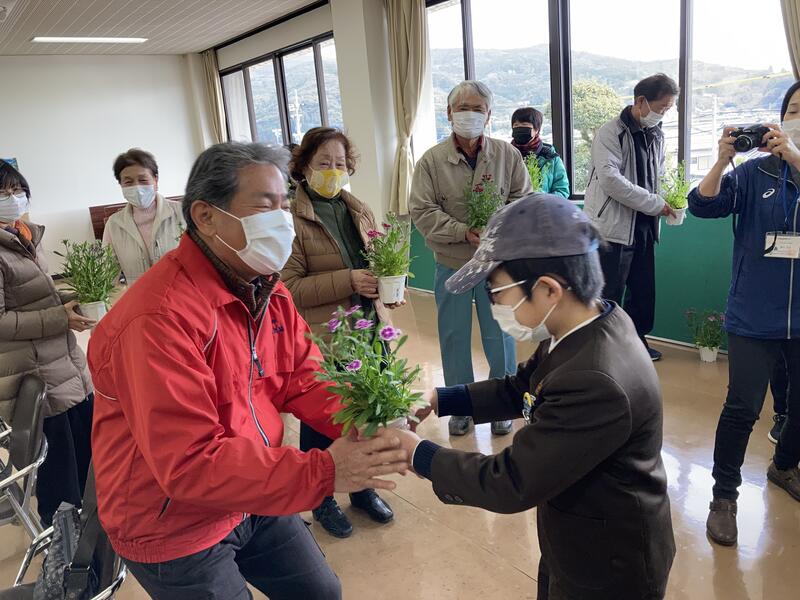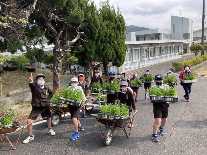 子ども民生委員の活動として全校児童で「花の宅配便」に取り組んでいます。自分たちで種から育てた花の鉢植えを、地域の一人住まいのお年寄りの方へ届けようという活動です。毎年行っていますが、新型コロナの影響により、子供たちが直接お届けするのが難しいことから、昨年度に引き続き、地域の民生委員さんにお願いして届けていただくことにしました。写真は児童代表として4年生が社会福祉協議会を訪れ、民生委員さん方にお願いしている様子です。1日も早く直接手渡しできる日が戻ってくることを願っています。民生委員の皆さん、どうぞよろしくお願いします。