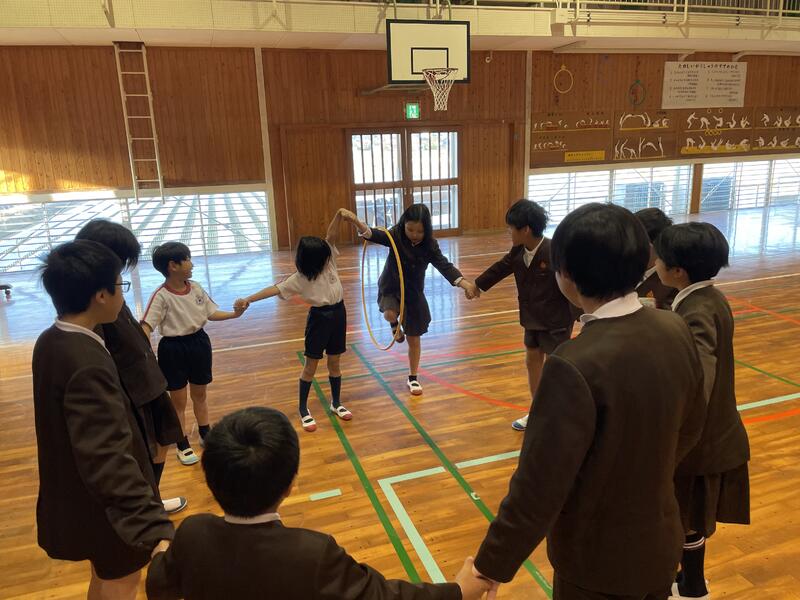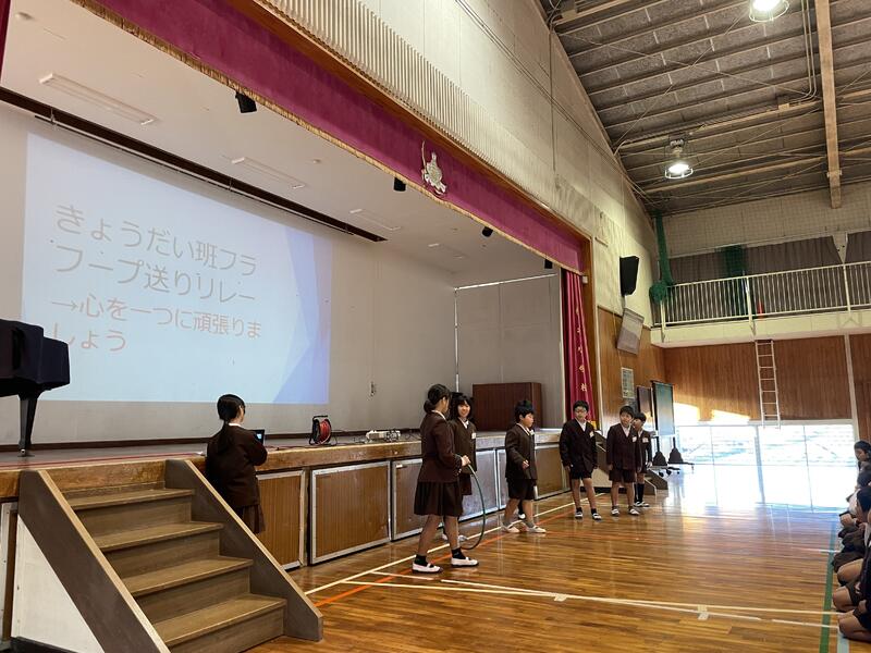 【仲良し集会の様子~きょうだい班フラフープ送りリレー~】