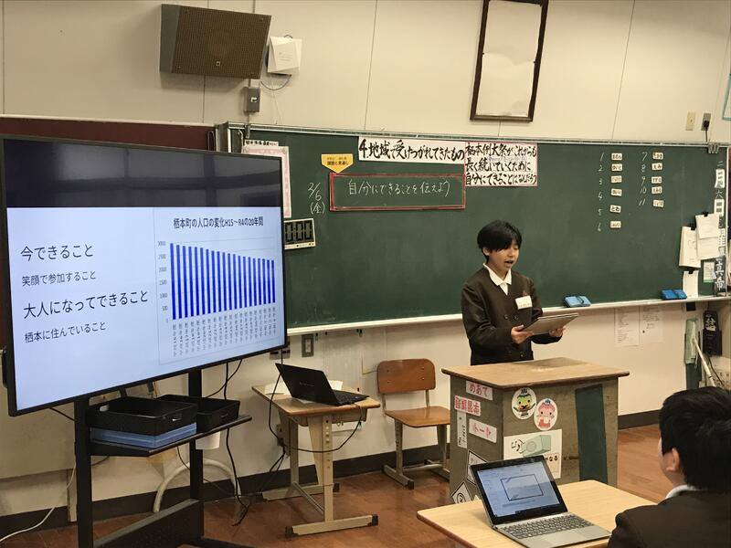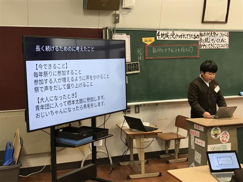 2月6日(金)、2時間目、4年生の教室では社会科の学習「地域で受けつがれてきたもの」の集大成として、子供たちが調べてきた「栖本例大祭」について、地域の先生方をお招きして発表を行いました。