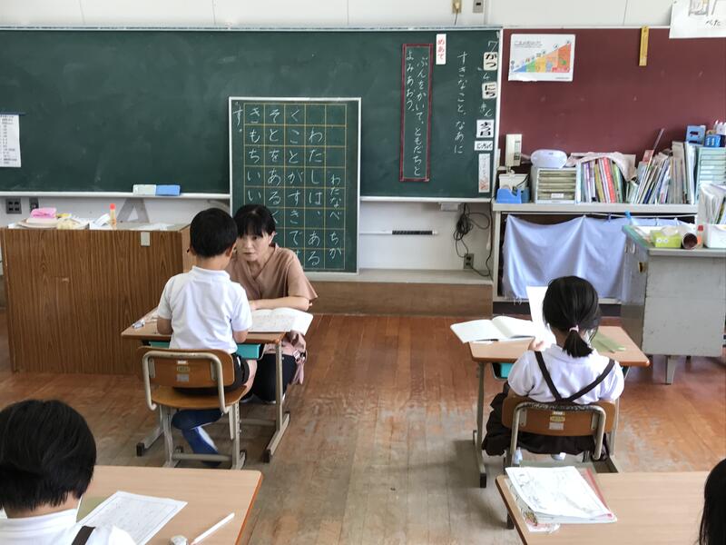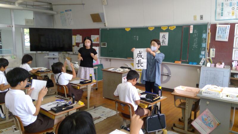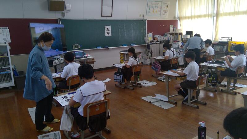 1年生の教室では、書写の時間、お手本をじっと見つめ、先生の「ここをこうするんだよ」という声に耳を傾けながら、丁寧に字を書いていましたね。とめ、はね、はらいに気をつけながら、一画一画集中して書く姿は本当に立派です。日に日に文字が上達しています。