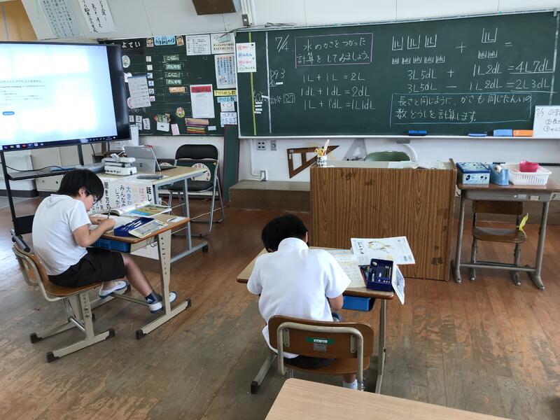 2年生は、算数で「水のかさ」を使った計算問題に挑戦していました。リットルやデシリットルといった単位に戸惑いながらも、「長さの計算と同じように、同じ単位同士で計算するんだよ」という先生の説明を真剣に聞き、黙々と練習問題に取り組んでいました。難しい問題にもあきらめずに、粘り強く取り組む姿は、今後の大きな成長に繋がるはずです。