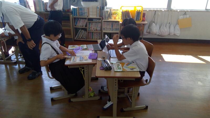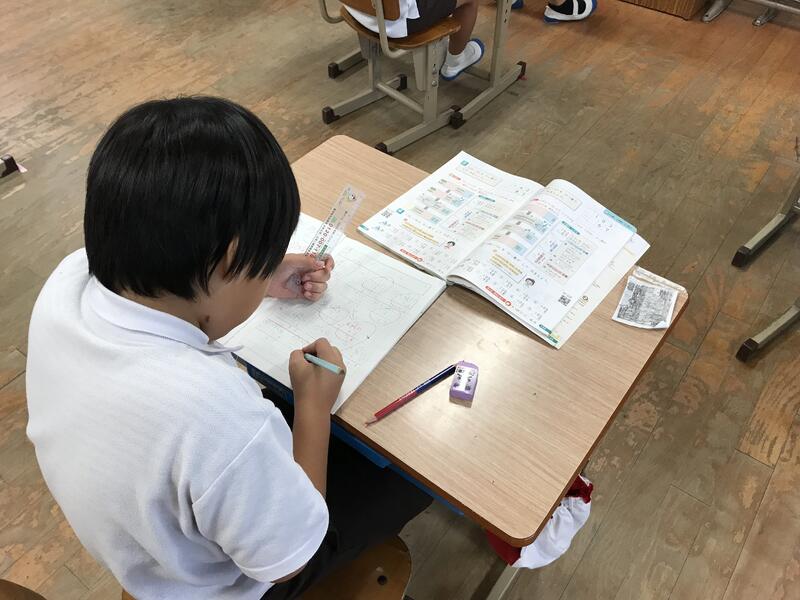4年生の算数では「四角形」の学習に取り組んでいました。特に平行四辺形を正確に描くことに集中し、真剣な表情で三角定規を使って互いに教えあったり、確認し合ったりしていました。