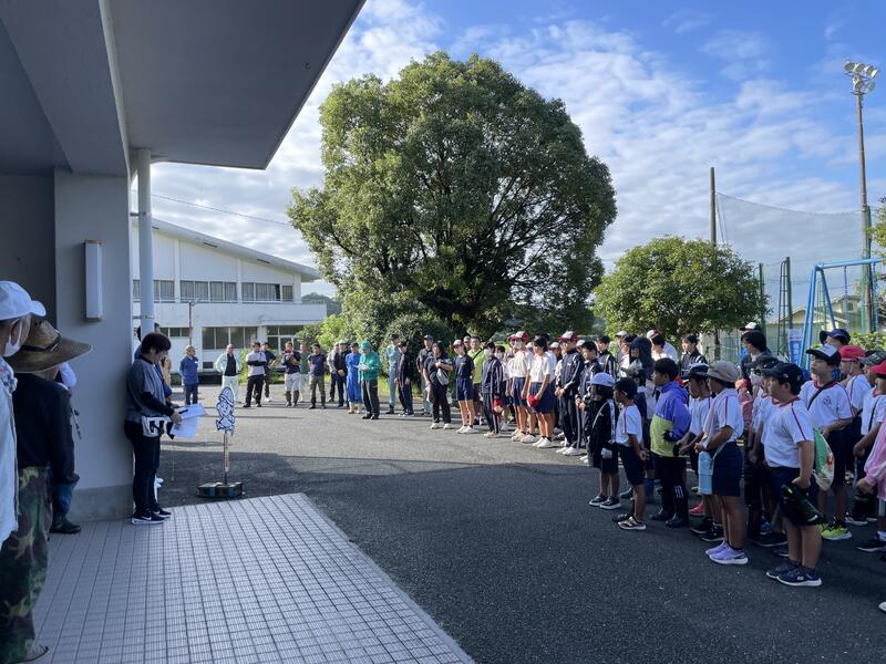 火災を知らせる放送を聞き、全員が運動場の避難場所へ迅速に避難することができました。 特に感心したのが子どもたちが「お・か・し・も・ち」という大切な避難の五原則をしっかりと守り抜いたことです。話をしたり、押したりしない、落ち着いた移動。火災の際の最大の脅威である煙から身を守るため、校舎内を移動する際には腰を低くし、鼻や口をハンカチや手で覆う姿が随所に見られました。これは、煙を吸い込まないための、自分の命を守る非常に重要な姿勢であり、子どもたちが訓練の目的である「災害発生の際、自分で判断し、迅速かつ安全に避難行動ができるようになること」を深く理解していたからできたのだと思います。