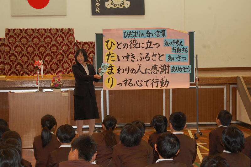 就任式の後、引き続き始業式がありました。校長先生の話の中では、「ひだまりの合いことば」の紹介がありました。「ひ」ひとの役に立つ 「だ」だいすき、ふるさと 「ま」まわりの人に感謝