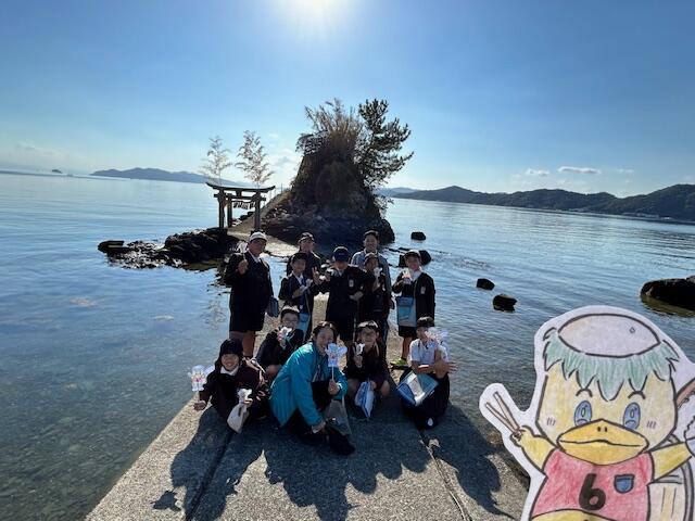 総合的な学習の時間に6年生は、青年団の猪原さん・樫原さんと一緒に実際に栖本を歩きながら栖本のよさや歴史を探しました。6年生10人でアイディアを出し合い作成したキャラクター「カッピー」と共に思い思いの構図で写真に収めました。