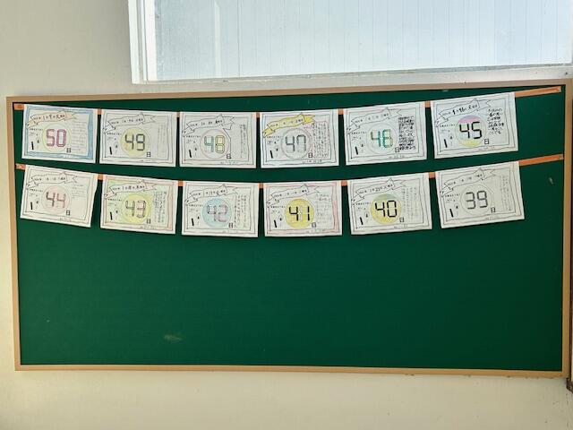 6年生の階段掲示板には、卒業式までのカウントダウンカレンダーが並んでいました。