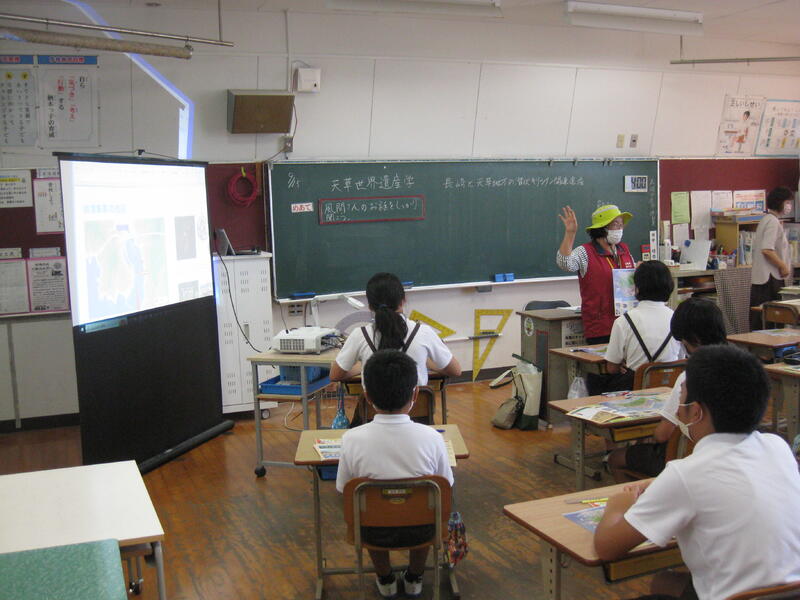 6年生は世界遺産学と題し、総合的な学習の時間に世界遺産「長崎と天草地方の潜伏キリシタン関連遺産」について詳しく学習を続けています。今日はゲストで現地ガイドをされている風閒様をお招きし、講話をしていただきました。