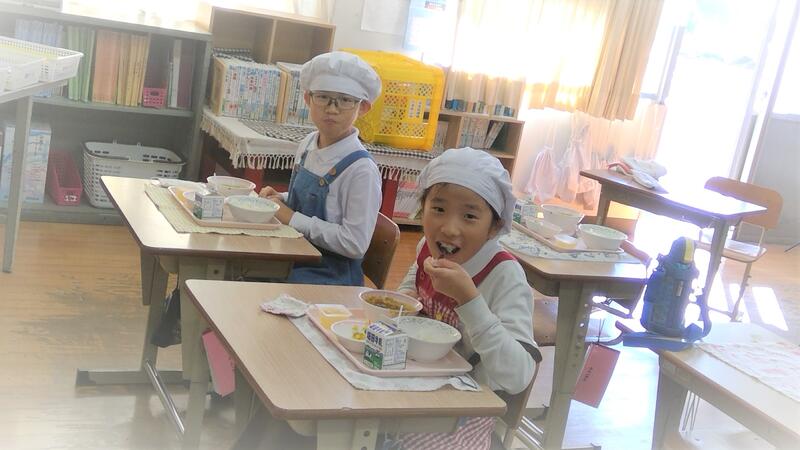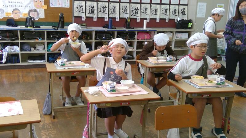 今週の給食で5年生が田植えから稲刈りまでを経験し、育ててきたお米が給食で出されました。