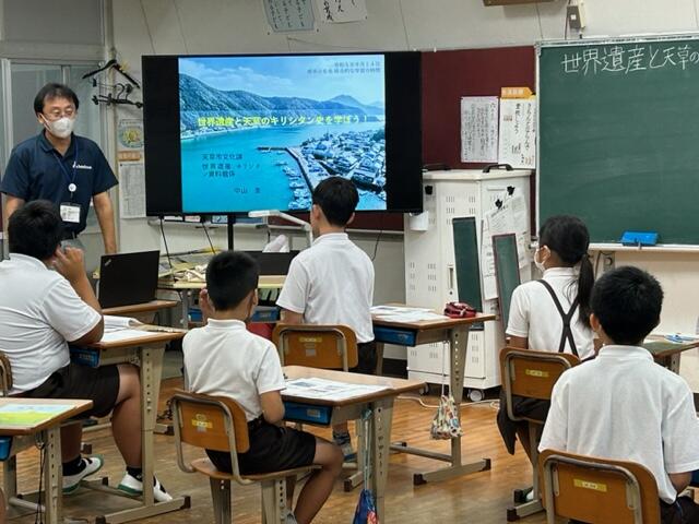 9月14日(木) 6年生は総合的な学習の時間に、天草市文化課の中山様から講座「世界遺産と天草のキリシタン史を学ぼう!」を受けました。天草の﨑津集落が世界遺産に登録されて5年になりますが、6年生にとっては初めて知ることも多く、「講座の中に出てきた『栖本城』についても探究したい!」と次の課題も見つけていました。
