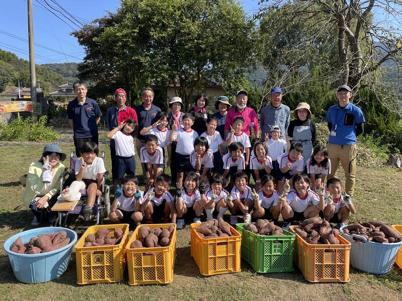 11月1日(水) 今年は、1・2年生の いもほり に地域の方々が8人も集まってくださいました。地域の方と楽しい会話を交わしながら掘る笑顔も光り、いもが顔を出す度に「うわっ!大きい!」「繋がって出てきた~!」と子供たちの歓声が湧いて ちびっ子農園は大賑わいでした。
