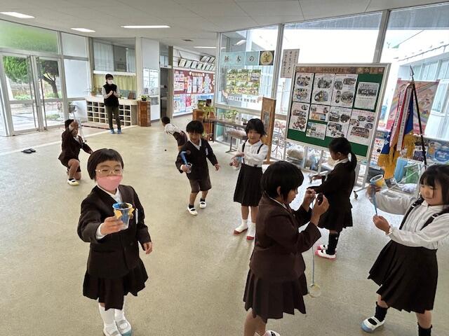 12月11日(月) 1年生が、生活科「きせつとなかよし」の学習でけん玉を作り、楽しく遊びました。拾ったイチョウの葉やどんぐりをカップの外側に装飾し、松ぼっくりを紐の先に固定してできあがり♪